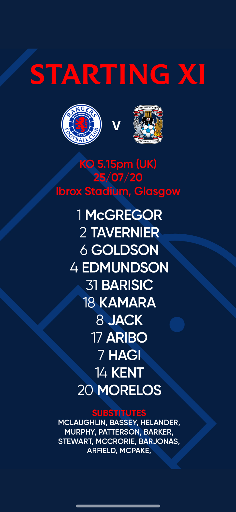 Rangers final pre-season test saw newly promoted English Championship side Coventry visit Ibrox. Rangers started with the eleven which I fully expect to see start our first league match next week against Aberdeen.