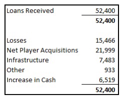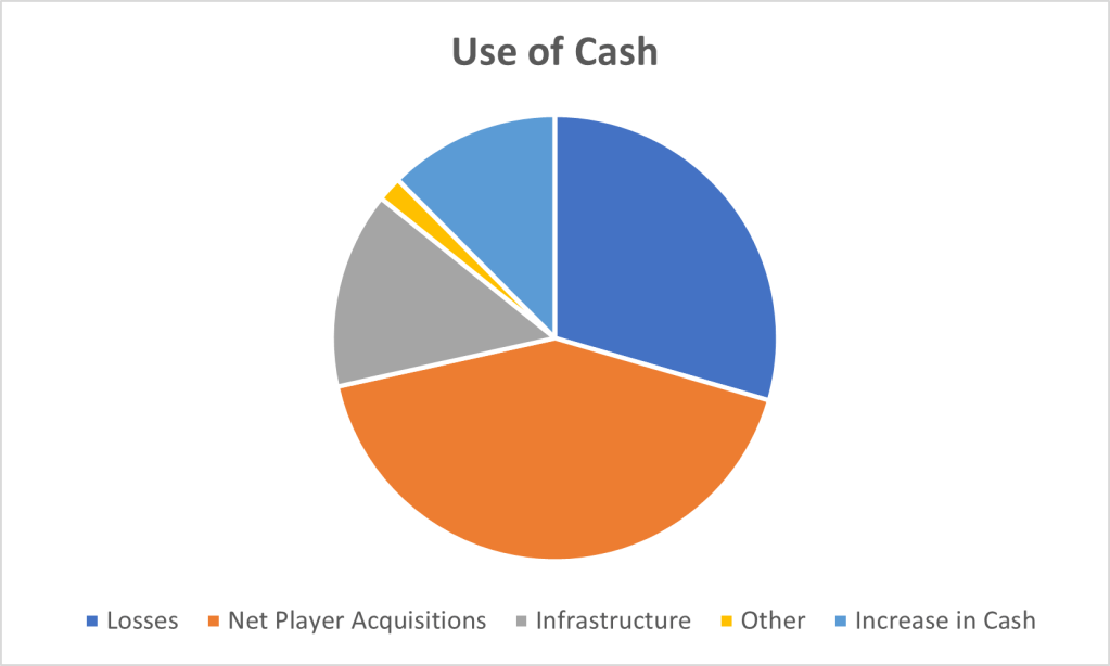I have laid out how this cash has been spent since FY15. As can be seen below, the investor loans have been used to fund day to day trading losses (£15.5m/30%), net player acquisitions (£22.0m/42%), infrastructure (£7.5m/14%), increase in cash balance (£6.5m/12%) with a small amount used for interest payments amongst other things (£0.9m/2%).