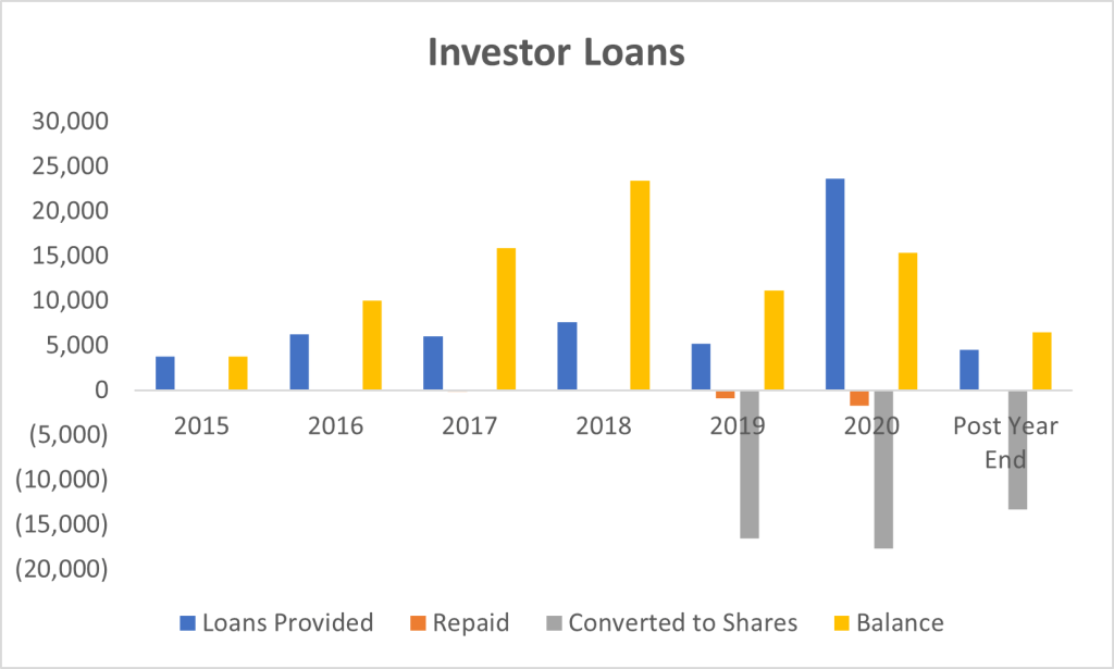 At the year-end (30 June 2020), £15.3m of these loans were ‘outstanding’ meaning £37.1m had been converted to shares over the previous two years. £13.3m of the year-end balance was converted to shares between the year-end and the publication of the accounts (17th November 2020).