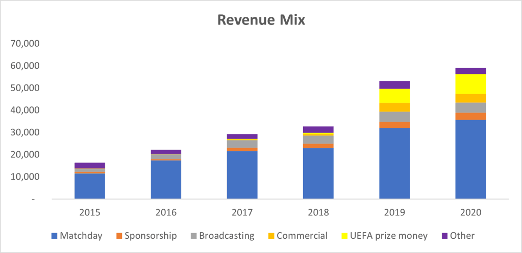 This year’s growth has come from our better performance in the Europa League with two more home games (Braga & Bayer Leverkusen) generating additional ticketing income and UEFA prize money for qualifying. The Europa League campaign was worth £20.7m in FY20 (35% of revenue) versus £14.7m in FY19, highlighting just how critical qualification is to the club. With an ever increasing co-efficient, both club and country, qualification for the Europa League group stage should begin to become the minimum we can expect each year. Other revenue streams such as sponsorship and broadcasting showed modest increases.