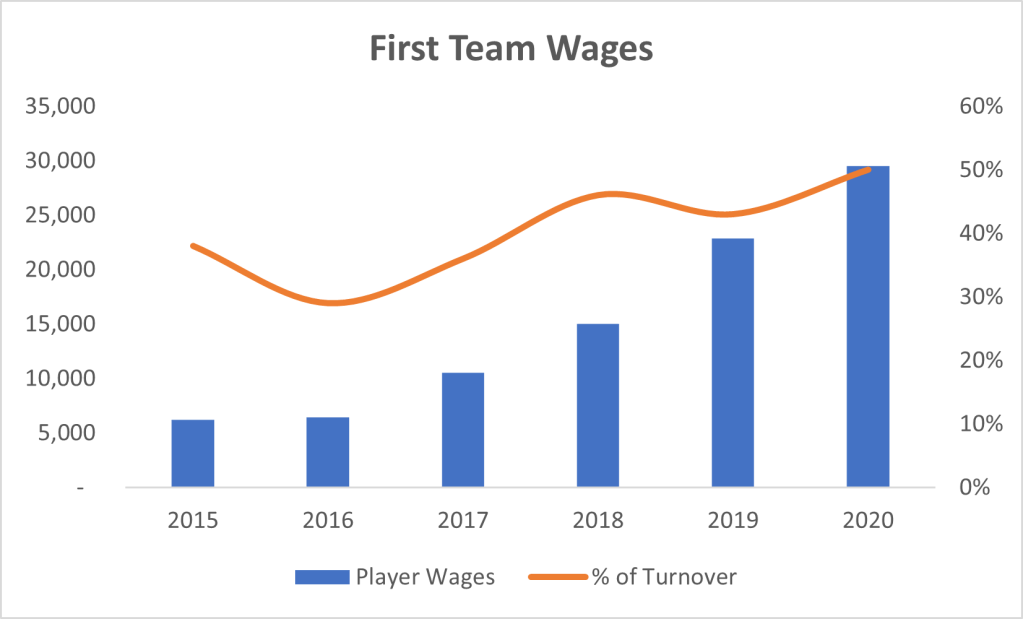 The club’s biggest expenditure is salary costs. We have seen a huge increase in first team wages from £6.2m in FY15 to £29.5m in FY20. Our first team wages to turnover ratio was 50% which is an increase on 43% in the prior year.