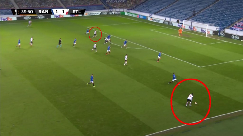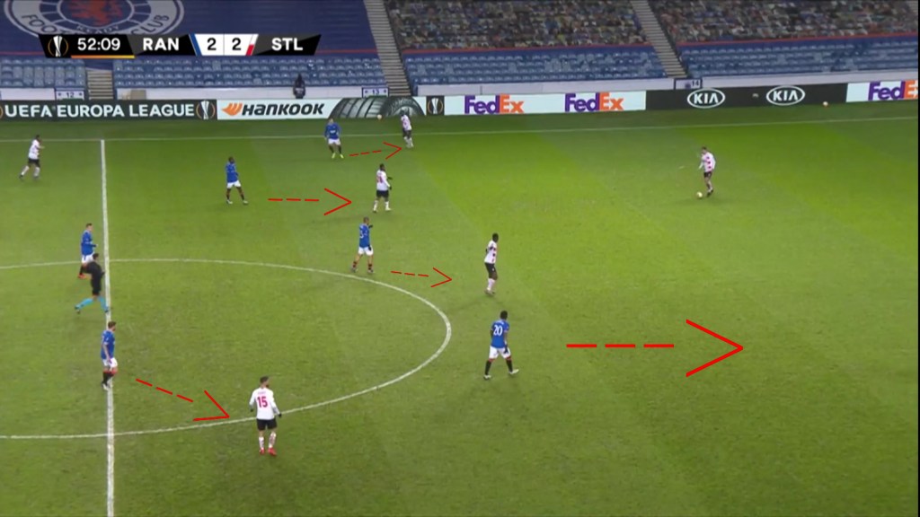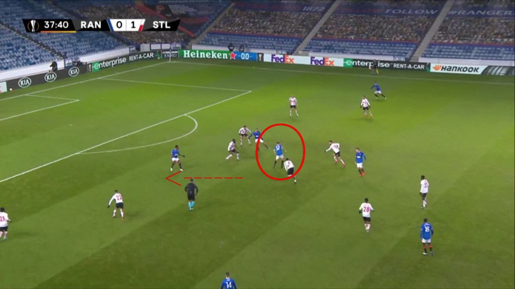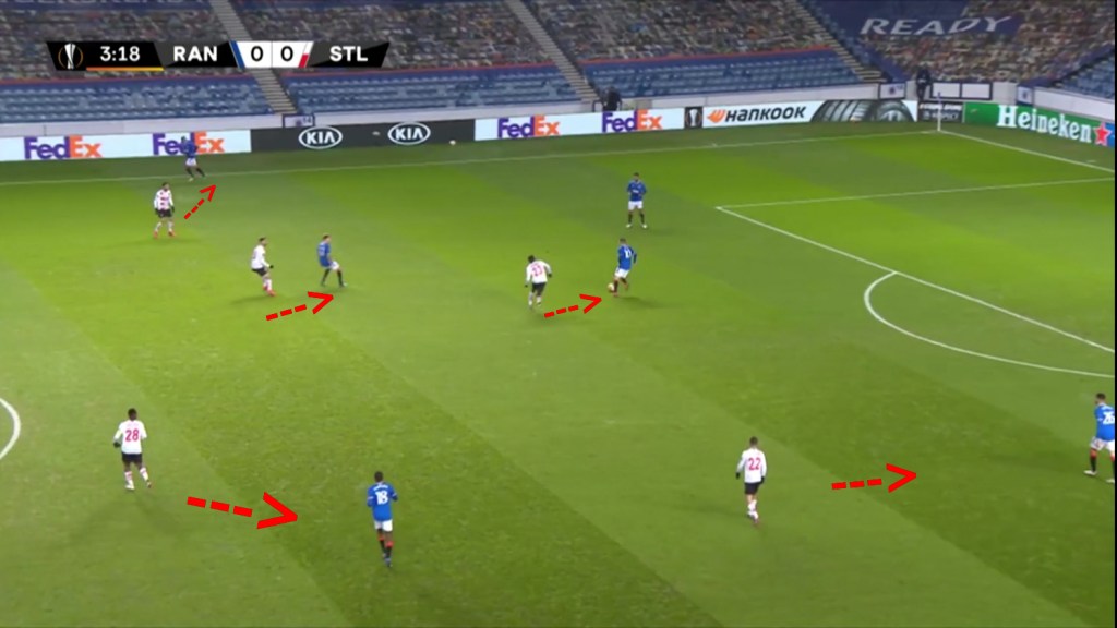 It was now Rangers pressing higher and no longer allowing Standard to easily play out from the back. When Standard did find a way through the press, Kent and Arfield were now providing the fullbacks with cover to nullify the first half overloads.