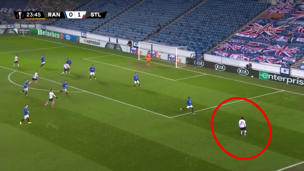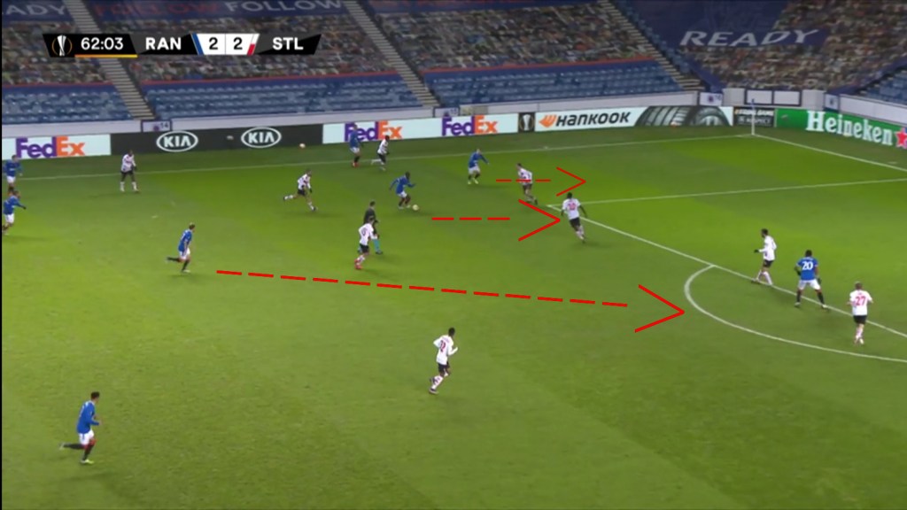 This pattern would carry on for the next 20 minutes, Standard put in dangerous crosses from very similar positions on 5 occasions within the first 25 minutes as Rangers struggled to cope with the wide overloads that the 3-4-3 was allowing Standard.