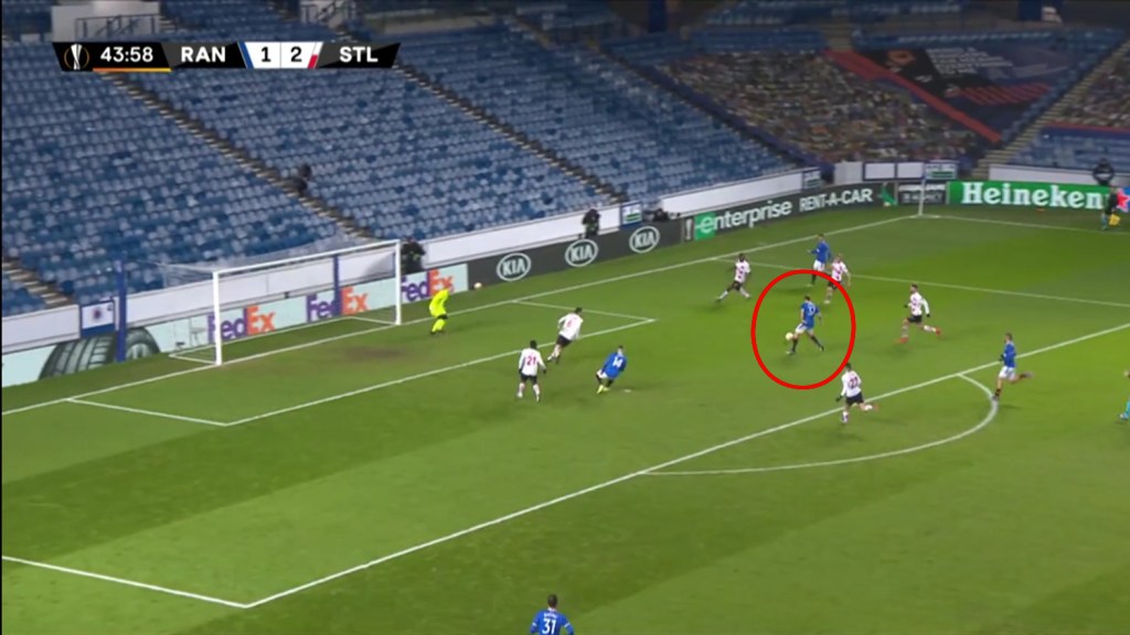 It took 29 minutes for the first real bit of good play from Rangers in an advanced area, finally getting Barisic into the final third and Tavernier also able to advance on the other side.