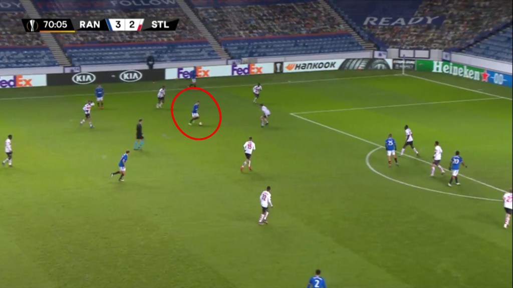 A few minutes later Rangers levelled the game and it came via Arfield taking up that very position, finding the gap between the Standard defence and midfield, a quick reverse pass through to Morelos forced a corner which Connor Goldson powered home.