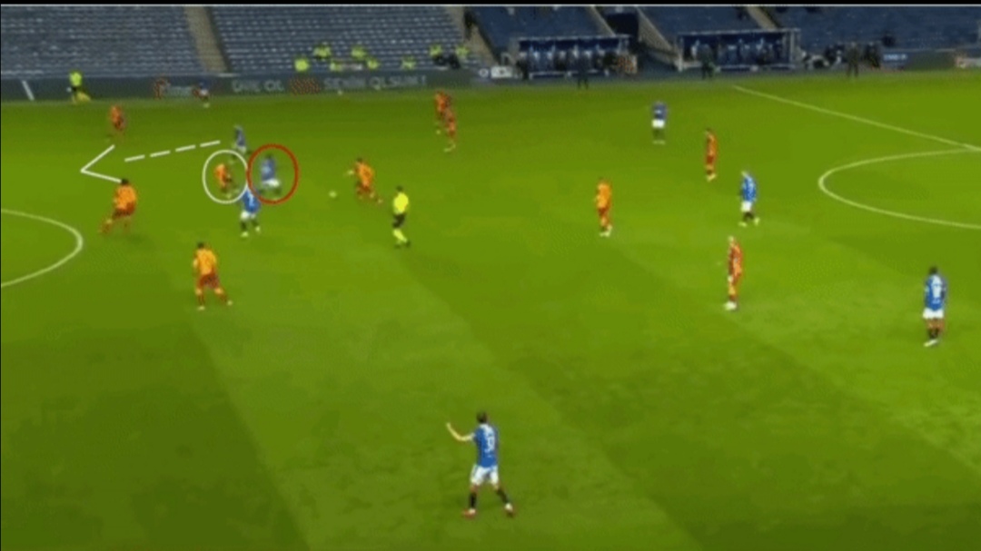 To progress to the Europa League group stages Rangers had to go through Galatasaray, once again it was the movement of Morelos dropping deep that pulled the CB out of position to create the space for Arfield to run into, Morelos’ dummy to Hagi also crucial: