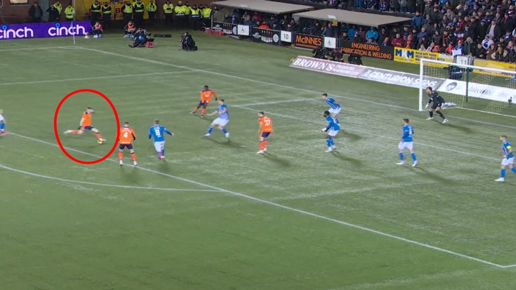 Another example of that freedom is on display here. This time it’s Tillman and Cantwell who have switched positions with Kent in his more typical left sided area. However, he once again makes use of his freedom to attack the central space which allows him a shot at goal from 18 yards.