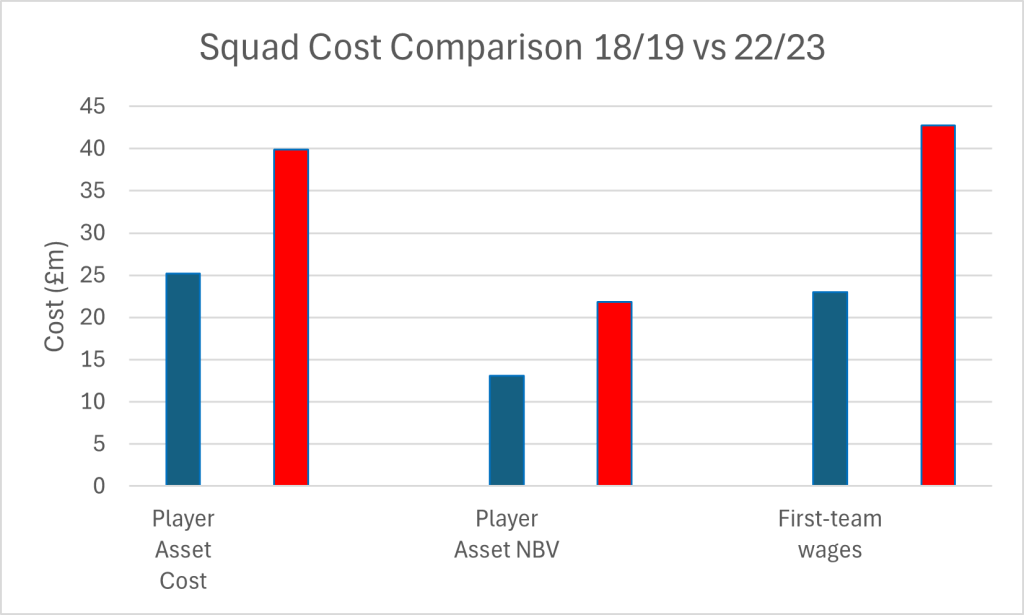 A similar story can be noted with transfers. The club’s financial statements note the squad ‘cost’ as of 30 June 2023 at £39.9m vs the lowly comparable of £25.2m in 2018/19. In the summer gone past we know that we spent a whopping £21.0m on incoming players, gross, and so this disparity will likely increase once the 23/24 figures are published.
